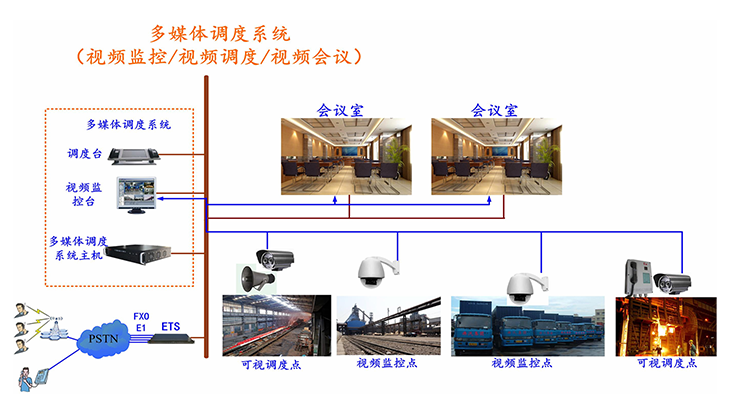 多媒體調(diào)度指揮系統(tǒng)是調(diào)度系統(tǒng)的一個子系統(tǒng),可實現(xiàn)“視頻監(jiān)控、視頻調(diào)度、視頻會議”等功能。調(diào)度臺配有一臺視頻監(jiān)控臺,用以實現(xiàn)調(diào)度員實時視頻監(jiān)控的功能,當調(diào)度員需進行視頻調(diào)度時,通過點擊調(diào)度臺上的調(diào)度點按鈕即可將該視頻點的圖像調(diào)出,如該調(diào)度點有擴音設備(擴音器)或電話時,擴音設備(擴音器)或電話將自動接通。當召開視頻會議時,如需要可將視頻調(diào)度點的視頻圖像接入到會議室中。