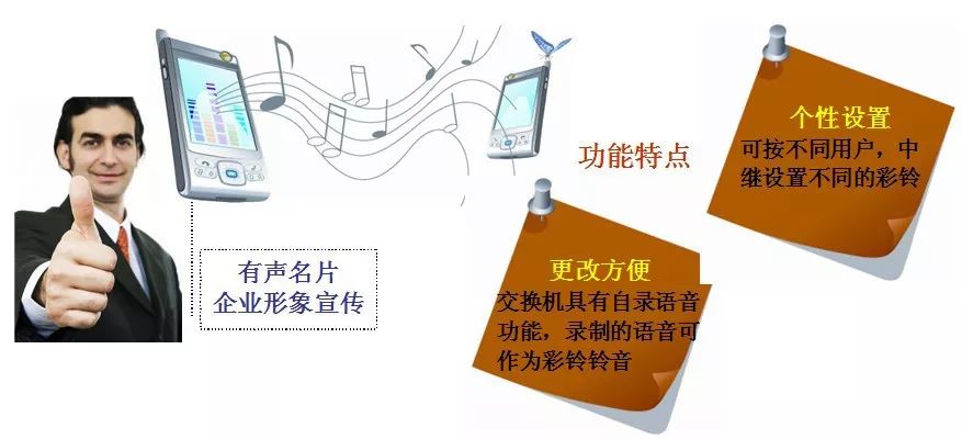 可設(shè)置個性化音樂作為彩鈴,用戶撥打公司號碼或員工手機(jī)均可聽到彩鈴,提升企業(yè)統(tǒng)一形象。