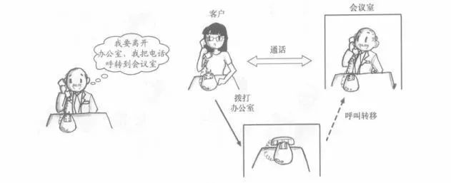 呼叫后轉(zhuǎn):你和某個(gè)客戶溝通,發(fā)現(xiàn)客戶的問題涉及到專業(yè),你無法回答時(shí),你需要另一個(gè)更專業(yè)的同事來接聽,最好的方式就是在通話過程中把電話轉(zhuǎn)移到你同事的電話上,這就是呼叫后轉(zhuǎn)---在呼叫建立之后轉(zhuǎn)移當(dāng)前的通話。