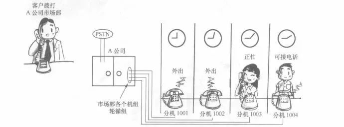 若干個(gè)分機(jī)形成一個(gè)組,當(dāng)一個(gè)電話呼叫其中分機(jī)的時(shí)候,該分機(jī)占線,PBX自動(dòng)轉(zhuǎn)到下一個(gè)分機(jī),若在占線,繼續(xù)轉(zhuǎn)到下一個(gè)分機(jī)去,直到某個(gè)分機(jī)接聽,或者所有分機(jī)占線。