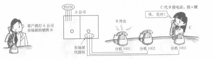 若干個(gè)分機(jī)形成一個(gè)組,其中一個(gè)人不在座位,無法接聽,別人可以操作某些按鍵,在自己的座位就可以代他接電話。這種組一般放在同一個(gè)部門的情況下。