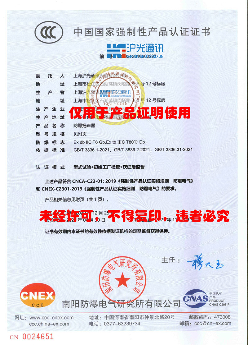 防爆揚(yáng)聲器3C認(rèn)證證書