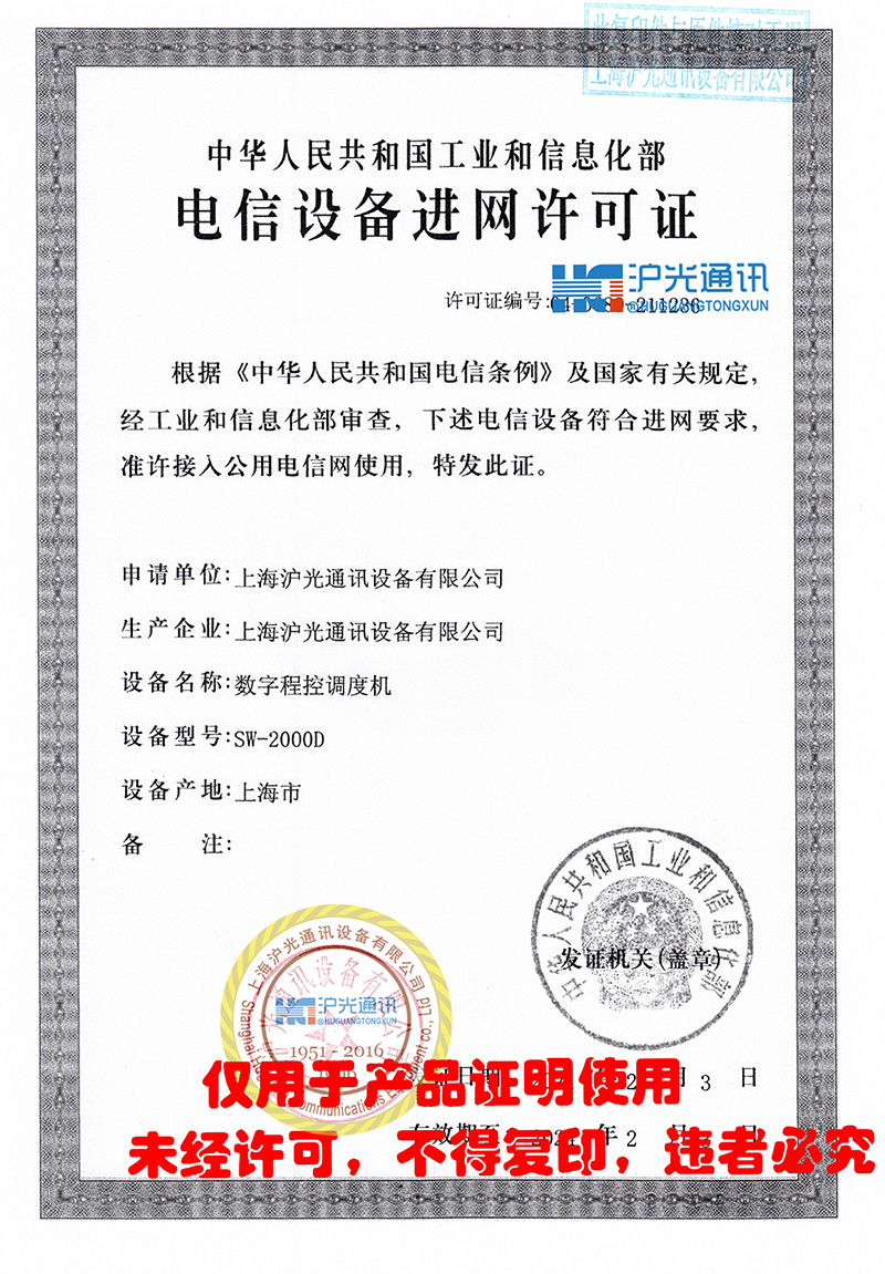 SW-2000D數(shù)字程控調(diào)度機(jī) 進(jìn)網(wǎng)許可證